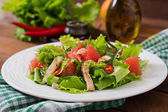 Sałatka z klopsiki, bakłażan, pieczarki i pomidory w stylu azjatyckim. Zdrowe jedzenie. Posiłki diety. Widok z góry. Leżał z płaskim.