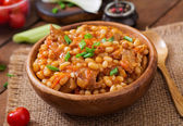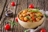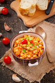 Fasola biała na parze z warzywami w sosie pomidorowym. Wegańskie. Azjatycki posiłek.
