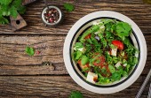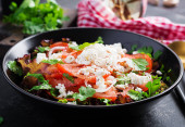 Sałatka z pomidorami, serem i kolendry w słodko-kwaśnym sosie. Dania kuchni gruzińskiej. Zdrowa żywność.
