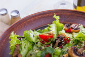 Sałatka z klopsiki, bakłażan, pieczarki i pomidory w stylu azjatyckim. Zdrowe jedzenie. Posiłki diety. Widok z góry. Leżał z płaskim.