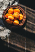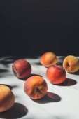 płaskie lay z dojrzałych brzoskwiń w metalowe miski z połyskuje na światło powierzchnia marmuru z cieniami