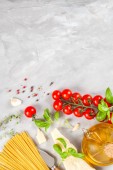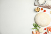 Ciasta i składniki na pizzy na jasnym tle, widok z góry
