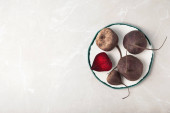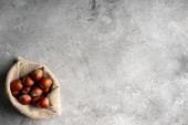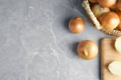 Miska z świeżej cebuli dojrzałe na tabela, widok z góry