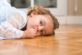 Piękne dziecko blondynka o niebieskich oczach w domu jedzenie cukierków.