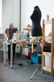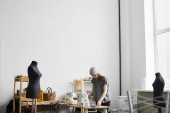 skoncentrowane krawiec za pomocą szycia wzorów podczas pracy przy tworzeniu ubrań w atelier