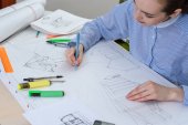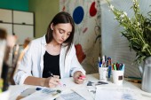 Młoda kobieta krawiec i rysunku modelu ubrania w atelier