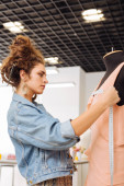 Kobieta krawcowa profesjonalny pomiar spódnica na manekinie w atelier