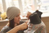 krawcowa krawieckie tkaniny, siedząc na krześle w atelier
