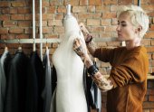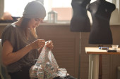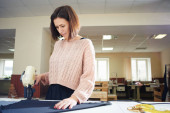 atrakcyjny brunetka krawieckie w kapelusz stojący w atelier