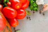Dojrzałe pomidory czerwone i żółte, zielonej cebuli i bazylii, czosnek, sól i przyprawy na ciemnym tle kamienia. Widok z góry, miejsce.