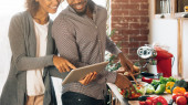 Czarny para przy użyciu cyfrowego tabletu podczas przygotowywania kolacji