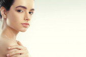 Zdjęcie "Piękna twarz. Piękna kobieta z naturalnego makijażu dotykać twarzy. Dziewczyna z czystego, świeżego skóry. Zbliżenie. Kosmetologia. Pielęgnacja skóry. O wysokiej rozdzielczości" może być wykorzystywane do celów osobistych i komercyjnych zgodnie z warunkami zakupionej licencji Royalty-free. Obraz jest dostępny do pobrania w jakości wysokiej rozdzielczości do 5760x3840.