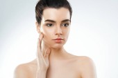 Piękna twarz. Piękna kobieta z naturalnego makijażu dotykać twarzy. Dziewczyna z czystego, świeżego skóry. Zbliżenie. Kosmetologia. Pielęgnacja skóry. O wysokiej rozdzielczości