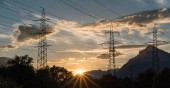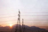 zachód słońca w krajobraz górski z linii elektrycznych i masztów na pierwszym planie