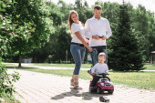 Zdjęcie "Szczęśliwy młody koncepcja rodziny. Piękna blonde matka i Brodaty stylowe ojciec spaceru w parku z ich córeczkę w wózek." może być wykorzystywane do celów osobistych i komercyjnych zgodnie z warunkami zakupionej licencji Royalty-free. Obraz jest dostępny do pobrania w jakości wysokiej rozdzielczości do 5760x3840.