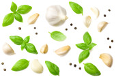 Kompozycja z świeżego czosnku, bazylii i pieprzu na białym tle na białym tle