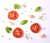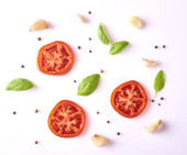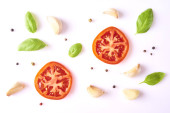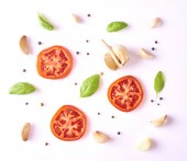 Kompozycja z świeżego czosnku, bazylii, pomidor i pieprzu na białym tle