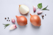 Koncepcja żywności. Kompozycja świeży czosnek, liście kolendry i pieprzu na białym tle na turkus tło