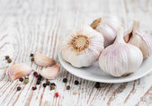 Bliska dużo świeżego surowego czosnku żarówki z maleńkich rozmaryn pozostawia w drewniane miski na rustykalny szary tło