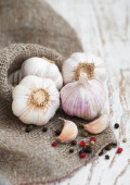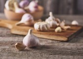 Koncepcja żywności. Zbliżenie: surowego czosnku spacy żarówki i ząbki w białe filiżanka na rustykalny szary tło drewniane