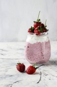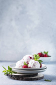 Domowej roboty lody z mrożonych wiśni i mięty w szkło kubek. Zbliżenie na jasnym tle.