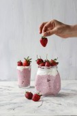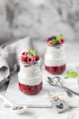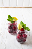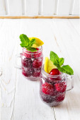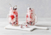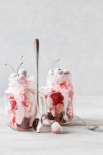 Dwie porcje lodów w kubki szklane z mrożonych wiśni. Zbliżenie na jasnym tle.