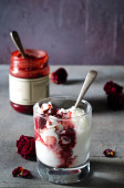 Dwie porcje lodów w kubki szklane z mrożonych wiśni. Zbliżenie na jasnym tle.