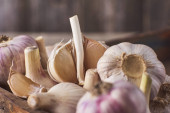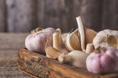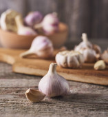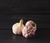 Szczelnie-do góry widok surowego czosnku spacy żarówki i ząbki na czarny deska drewniany