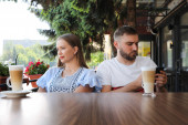 Zdjęcie "Atrakcyjna para - czarujący blond kobieta ubrana w białą bluzkę i Brodaty mężczyzna z stylowe fryzury, ubrany w białą koszulę podczas dnia w kawiarni na świeżym powietrzu." może być wykorzystywane do celów osobistych i komercyjnych zgodnie z warunkami zakupionej licencji Royalty-free. Obraz jest dostępny do pobrania w jakości wysokiej rozdzielczości do 5760x3840.