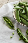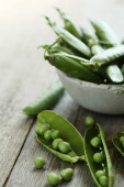 Uzytkownia-w górze widok Hearthy świeży zielony groszek i strąków drewniane miski na tle rustykalnym