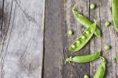 Bliska Hearthy świeży zielony groszek i strąków na rustykalne drewniane tła