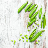 Bliska Hearthy świeży zielony groszek i strąków na rustykalne drewniane tła