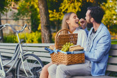 Szczęśliwy, średnim wieku para podczas randki, piknik na ławce w parku.