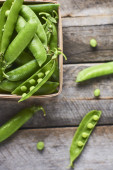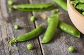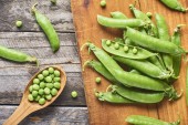 Bliska Hearthy świeży zielony groszek i strąki w drewnianą łyżką na tle rustykalnym