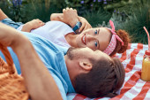 Zdjęcie "Szczegół obrazu para szczęśliwy średnim wieku podczas romantycznej randki na zewnątrz, piknik leżąc na kocu w parku. " może być wykorzystywane do celów osobistych i komercyjnych zgodnie z warunkami zakupionej licencji Royalty-free. Obraz jest dostępny do pobrania w jakości wysokiej rozdzielczości do 5760x3840.