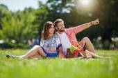Portret szczęśliwy średnim wieku pary podczas romantycznej randki na zewnątrz, piknik siedząc na powrót na kocu w parku.
