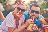 Zdjęcie "Portret szczęśliwy średnim wieku pary podczas romantycznej randki na zewnątrz, piknik siedząc na powrót na kocu w parku. " może być wykorzystywane do celów osobistych i komercyjnych zgodnie z warunkami zakupionej licencji Royalty-free. Obraz jest dostępny do pobrania w jakości wysokiej rozdzielczości do 5760x3840.