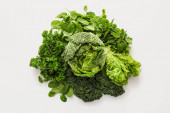 Różnego rodzaju Sałatka z liści na białym tle na turkus tło. Sałaty, rukoli, fryz, czerwone twarde sałata, szpinak.