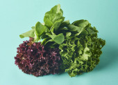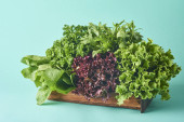 Zdjęcie "Różnego rodzaju Sałatka z liści na białym tle na turkus tło. Sałaty, rukoli, fryz, czerwone twarde sałata, szpinak." może być wykorzystywane do celów osobistych i komercyjnych zgodnie z warunkami zakupionej licencji Royalty-free. Obraz jest dostępny do pobrania w jakości wysokiej rozdzielczości do 5760x3840.