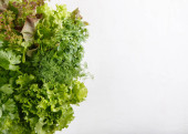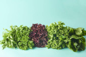 Różnego rodzaju Sałatka z liści na białym tle na turkus tło. Sałaty, rukoli, fryz, czerwone twarde sałata, szpinak.
