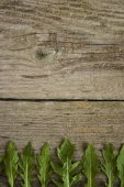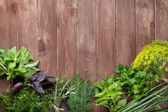 Różne rodzaje Sałatka pozostawia w drewniane pudełko na podłoże drewniane. Sałaty, rukoli, fryz, czerwone twarde sałata, szpinak.