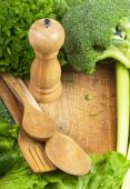 Listki sałaty na deska do krojenia nożem na podłoże drewniane. Przygotowanie sałatki. Różne rodzaje Sałatka pozostawia na tle. Rukola, fryz, czerwone twarde sałata, kapusta, sałata, szpinak.