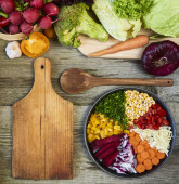 Listki sałaty na deska do krojenia nożem na podłoże drewniane. Przygotowanie sałatki. Różne rodzaje Sałatka pozostawia na tle. Rukola, fryz, czerwone twarde sałata, kapusta, sałata, szpinak.