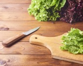 Listki sałaty na deska do krojenia nożem na podłoże drewniane. Przygotowanie sałatki. Różne rodzaje Sałatka pozostawia na tle. Rukola, fryz, czerwone twarde sałata, kapusta, sałata, szpinak.