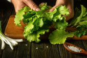 Zdjęcie "Listki sałaty na deska do krojenia nożem na podłoże drewniane. Przygotowanie sałatki. Różne rodzaje Sałatka pozostawia na tle. Rukola, fryz, czerwone twarde sałata, kapusta, sałata, szpinak." może być wykorzystywane do celów osobistych i komercyjnych zgodnie z warunkami zakupionej licencji Royalty-free. Obraz jest dostępny do pobrania w jakości wysokiej rozdzielczości do 5760x3840.