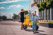 Trzy szczęśliwe modne kobiece przyjaciele stojący w pobliżu luksusowych aut Cabrio w parku.