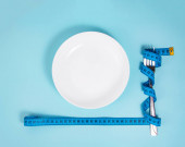 Płyta różowy z miara na białym tle drewnianych, widok z góry. Z góry płaski lay. Pojęcie diety.