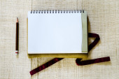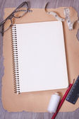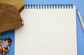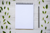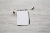 Miara zwijana z notebooka na biały drewniany stół, widok z góry. Lay płaskie, z góry.