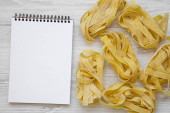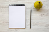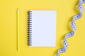 Zdjęcie "Miara zwijana z notebooka na biały drewniany stół, widok z góry. Lay płaskie, z góry." może być wykorzystywane do celów osobistych i komercyjnych zgodnie z warunkami zakupionej licencji Royalty-free. Obraz jest dostępny do pobrania w jakości wysokiej rozdzielczości do 5760x3840.