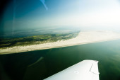 Piękny krajobraz aero z Morza Bałtyckiego, patrząc z okna samolotu małe pod skrzydła. Ryga, Łotwa, Europa w okresie letnim. Autentyczne doświadczenie latające w dzień słoneczny, zamglony. Powierzchni wody z odbicie słońca.